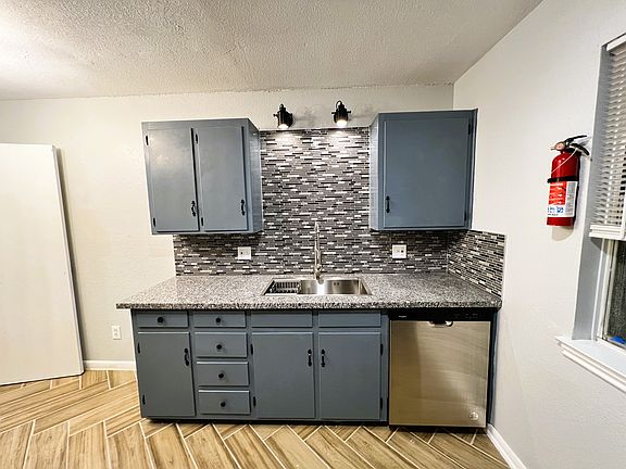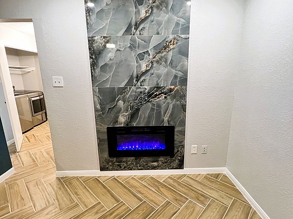 The living area highlights a striking feature wall with dramatic stone-style tile and a built-in electric fireplace that adds both ambiance and character. The kitchen offers updated blue cabinetry, stainless steel appliances, granite countertops, and a mosaic tile backsplash. A spacious laundry area with full-size washer and dryer connections sits just off the kitchen for added convenience. Washer/Dryer unit will stay for additional $25 month added to rent.