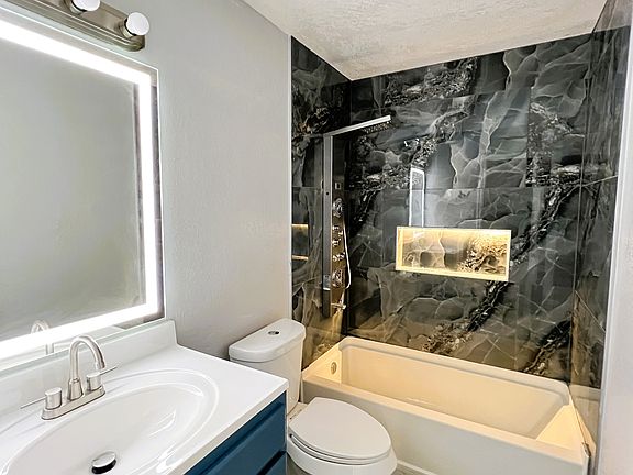 The bathroom is fully refreshed with a spa-inspired shower surround, premium tile work, and a multi-function shower panel.