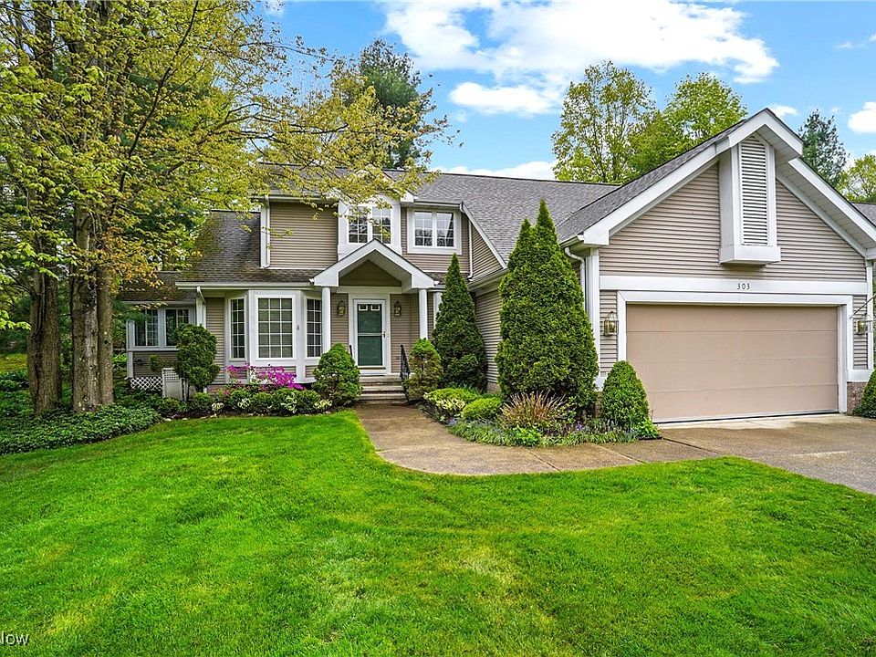 The first floor also has a convenient half bath, laundry room and attached two car garage. The second level has two substantial bedrooms and a full bath. Your rear yard has a wonderful STONE & BRICK PATIO and a private WATERFALL. The REAL BONUS is the location - situated on a private cul-de-sac maintained by the HOA, access to the Maple Highland Trail, close to restaurants, the Chardon Village Square, Chardon Lakes Golf Course, shopping, recreation, hospitals and Chardon Schools. Home Warranty is included.