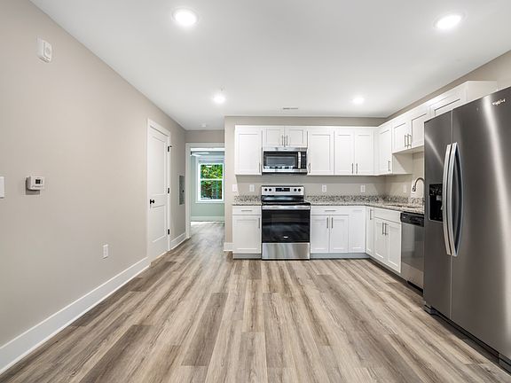 In-unit laundryLuxury vinyl floorsWhite cabinetsStainless steel appliances