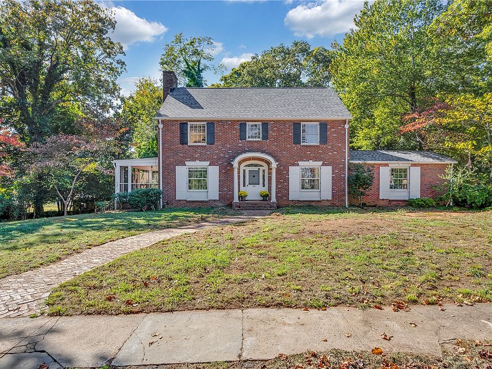 Brick georgian colonialStately front porchRear-entry two-car garageScreened-in side porchFlex spaceUnique low riser staircaseOriginal hardwood floors