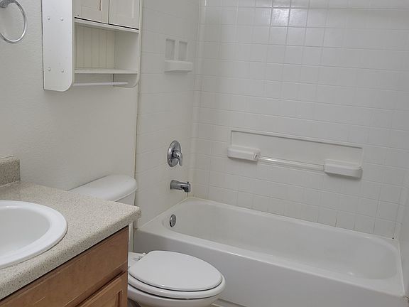 This is a great second level 2 bedroom, 1 bath condo with a large living area. This unit features newly refinished counters, tile and new carpet throughout. New washer and dryer. This gated community has a great pool, spa and BBQ area with grass and large trees.