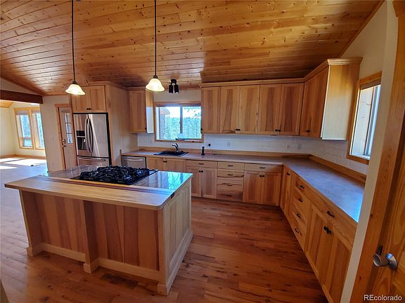 Dreamed of a log cabin in the woods where you can catch huge trout? Now is your chance. Log cabin sitting on just over 2 acres with towering pine trees and rock outcroppings. The setting is unmatched in Colorado, Turkey Rock Ranch is surrounded by Pike National Forest, has 10 STOCKED trout ponds/lakes and wonderful hiking trails. This log cabin is ranch style living in a very private setting. The custom kitchen cabinets, beautiful counter inlay and built-in entertainment center all handcrafted by the seller's nephew. The wood floors throughout make this the ideal mountain cabin. Additionally the 1080 Sq.ft garage is where you can store your cars and toys.