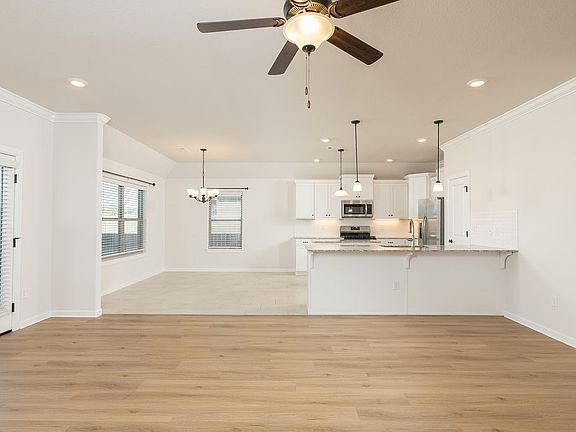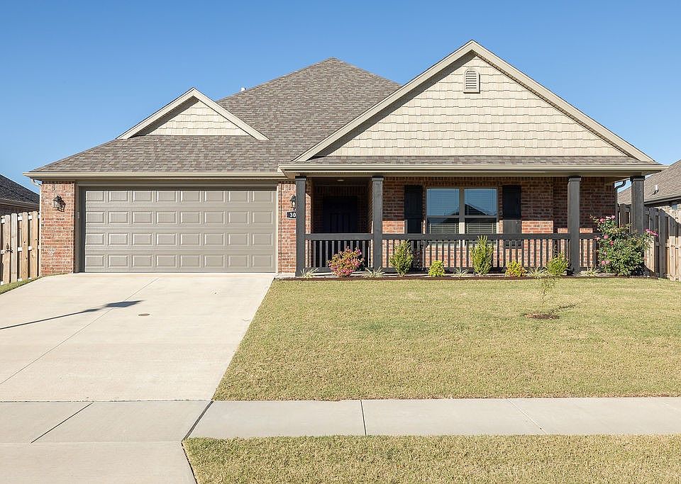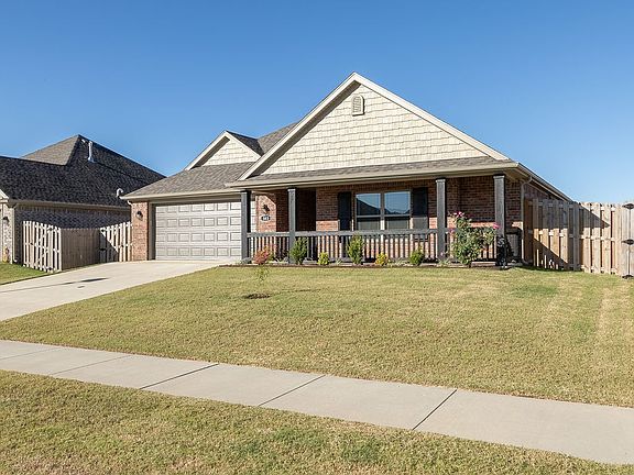 Move-in Ready Like-New barely lived-in 3/2/2 brick Home! Large front porch invites you into this 1 yr old home. Lovely split & open floor plan, fantastic island kitchen w/granite counters and pretty tile backsplash, large walk-in pantry, big walk-in closets, double vanity, soaker tub & walk-in shower in main bath, neutral (white) decor throughout! Pretty gas log fireplace in living room. Back porch is large and covered leading out to privacy-fenced back yard! No neighbor to the back of the house. Close to Walmart Neighborhood Market and Schools! Great front porch view of hills! Built by Riverwood Homes.