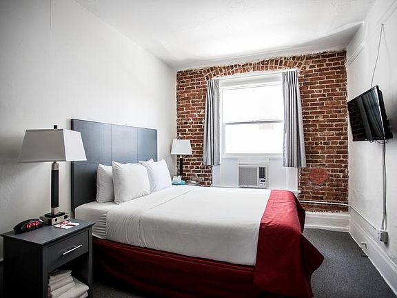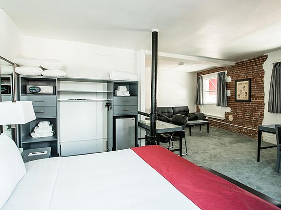 Our newly remodeled hotel offers 33 well-appointed private guest rooms with shared men's and ladies' restrooms, along with a single-use family restroom on each floor. Choose from a selection of rooms to create the perfect setting for your LA getaway. Ranging from single queen bedrooms to large family-style suites, our guest rooms come equipped with modern amenities and stunning views of Downtown LA. Our spacious suites feature an additional living space, while our one-bedroom suite provides guests with the additional luxury of a private bedroom within their suite. Discounted Daily and Weekly Rates