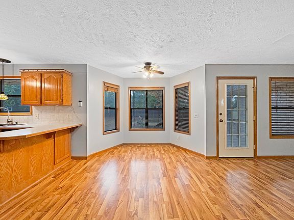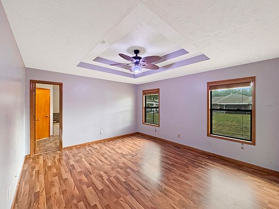 Step inside to an airy, open layout anchored by a spacious living room with a tray ceiling and backyard views. The adjoining dining area is wrapped in windows for beautiful natural light and flows to a breakfast bar kitchen. Perfect for everyday living and entertaining. Easy-care wood-look flooring carries through the main spaces. The private primary suite features a second tray ceiling and a roomy ensuite with a dual-sink vanity; additional bedrooms offer flexible space for guests, work, or hobbies. A large hall bath, generous storage, neutral paint tones, and updated matte-black fixtures make this home move-in ready while leaving room for your personal touch. Convenient location near everyday amenities. Come see why this one checks the boxes!