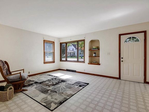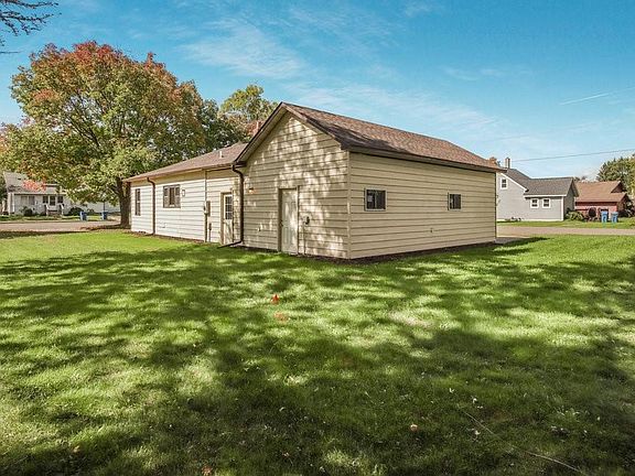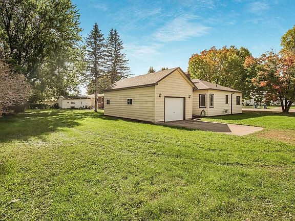 This cozy two bedroom, 1 bathroom gem in the heart of Rice Lake is ready for a new owner to move in and add their finishing touches! Original mid-century home architectural features include a large, lovely plastered living room with large windows and deep built-in shelving; beautiful archways; built-in hutches; and handy closets. Fantastic, multi-purpose breezeway connects to an oversized (30 x 16) one-car garage with workbench, cabinets, and a separate area for garden tools or extra storage. Updated bath, added landscaping, and repainted garage in 2025. Newer roof shingles (2023). Corner lot includes gorgeous mature trees and an extra parking pad accessible off Wisconsin St. and is just one block away from Rice Lake High School with parks, river walks just moments away!