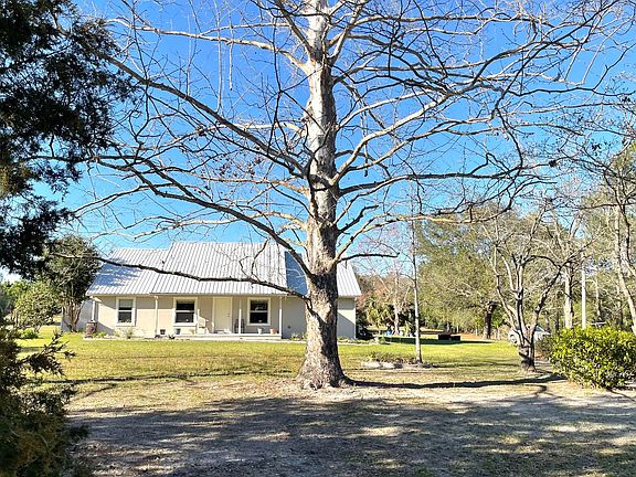 Welcome home! This custom block 3-bedroom, 2-bathroom home with a beautiful stucco finish offers the perfect blend of comfort, style, and outdoor living on a sprawling 4-acre lot. As you approach, you’ll be greeted by a welcoming front porch. The expansive back porch spans the length of the house, providing ample space for entertaining or relaxing in the fresh air, complemented by an open patio made with stylish pavers — perfect for hosting gatherings or enjoying quiet evenings under the stars. Step inside to discover a bright and airy open floor plan, where the living, dining, and kitchen areas flow seamlessly for effortless entertaining. The large master bedroom features a luxurious en suite bathroom with a spacious walk-in shower and custom built-ins in the closet, ensuring you have the perfect retreat to unwind. The tile throughout the home and most doors are ADA standards. A cozy office with a charming window seat and built-in bookshelves creates an environment for productivity or reflection, making it easy to stay organized and inspired. This property is a nature lover's paradise, boasting an array of fruit trees including blueberries, peaches, pears, persimmons, loquats, and pecans, as well as a flourishing muscadine grape vine. With plenty of room to roam and explore, the expansive grounds invite you to create your own private sanctuary. Don't miss your chance to own this exceptional home with endless possibilities for outdoor living and garde