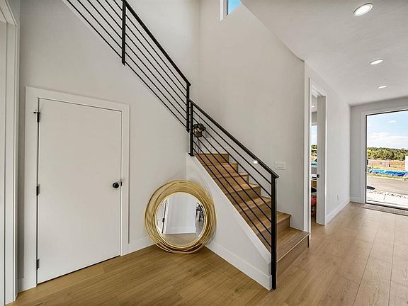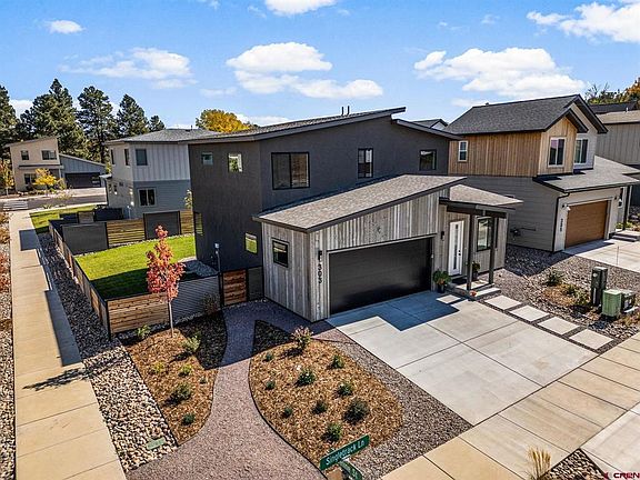 Welcome to the newest home in the highly desirable Elevation Park at Hope Springs neighborhood in Durango, CO. Step inside to a bright, airy two-story atrium at the front entry, where natural light floods the space. The home features a dedicated office at the front, and an open-concept kitchen and living area, with a large kitchen island and sliding glass doors that extend the living space to the back patio for seamless indoor-outdoor enjoyment. The heart of the home is the kitchen, with its double corner windows offering views of ponderosa pines and the resident red-tailed hawks, as well as peek-a-boo views of the mountains. The kitchen boasts striking white-walnut pantry cabinets paired with contrasting white cabinetry. A large quartz island, illuminated by two dramatic pendant lights, comfortably seats 4-6. The design ties together elongated white hexagon tiles, the striking geometric pendant lights, and the sleek Brisas hood over the range, adding to the kitchen’s modern aesthetic. Other kitchen appliances are stainless steel GE. Warm white-walnut tones flow throughout the home, from the Maxim Akimbo chandelier in the atrium to the 7.75” wide luxury vinyl plank flooring. Just outside, the back patio is nestled within a fully landscaped, irrigated, and fenced yard on a spacious corner lot. In the backyard, a northern catalpa tree stands out with its eye-catching blooms each spring. Eastern light from the back yard pours into the open living area, creating a bright and welcoming atmosphere. The oversized 489 sq. ft., 18-foot-wide garage allows for easy access and extra room for maneuvering. From the attached garage or covered front porch, enter the foyer where you'll find the dramatic atrium staircase, a half bath, a front hall closet, and the private office. Upstairs, a long hallway leads to the bright and spacious primary suite, where breathtaking views that will never be blocked greet you every morning. The en-suite includes a tiled shower and a quartz dual-sink vanity. Two other generously sized bedrooms are also upstairs, each offering ample space for comfort and relaxation. These bedrooms share a hallway bathroom with a soaking tub. Also upstairs is a large walk-in laundry room with a GE washer and dryer, a utility sink, and a west-facing window. The home is air-conditioned, with a forced air HVAC system and conditioned crawl space. The front yard is beautifully xeriscaped with an array of native plants on an irrigated drip system, complemented by a stunning red maple tree. 303 Singletrack Lane is a spec home- 100% move-in ready. Come see this incredible home designed by Reynolds Ash + Associates today!