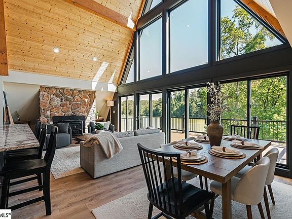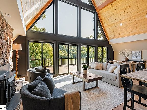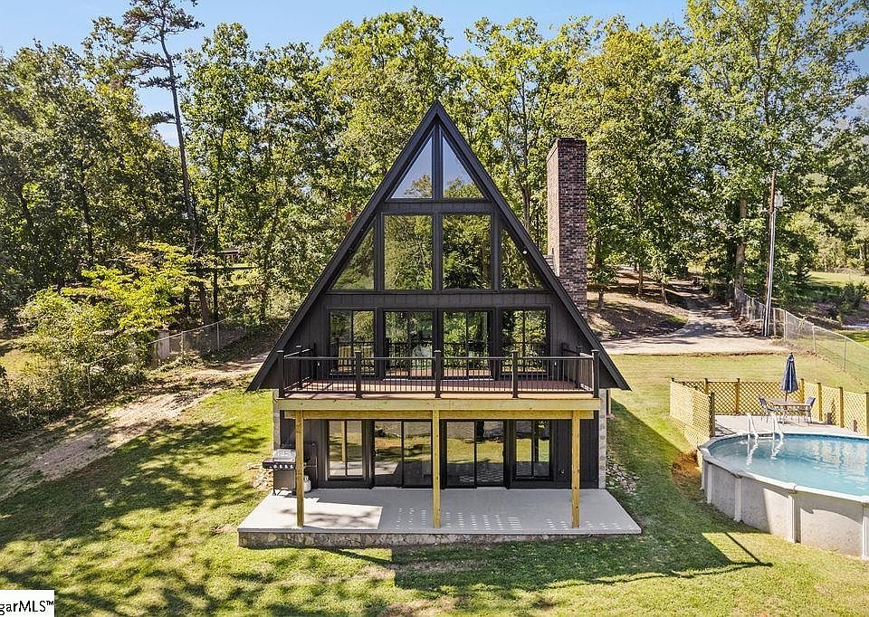 Just 15 minutes from downtown Greenville, this architecturally striking A-frame is a true showstopper with iconic design, a newly renovated interior and unobstructed lake views from all three levels. With 5 bedrooms, 3 bathrooms and 1.23 acres, this lakeside retreat is as functional as it is unforgettable. Inside, soaring ceilings and dramatic glass walls frame the water and flood the home with natural light, creating a living experience that feels equal parts modern escape and timeless statement. The granite kitchen features raw-edge wood shelving, a breakfast bar, and a beverage center with wine refrigerator. The thoughtful layout offers a main-level bedroom, a loft suite upstairs, and three additional bedrooms on the walkout basement level, where a large recreation room captures sweeping lake views. Outdoor living is equally spectacular here with its new Trex decking, a fire pit and above-ground pool making this property ideal for a year-round retreat. A circular driveway, easy direct water access, and no HOA restrictions add priceless features to this property. From its iconic A-frame silhouette to its turn-key renovations and negotiable bedroom furnishings, 303 Snyder Road is more than a home. It’s an architectural retreat and lakefront masterpiece. Schedule your private showing today.