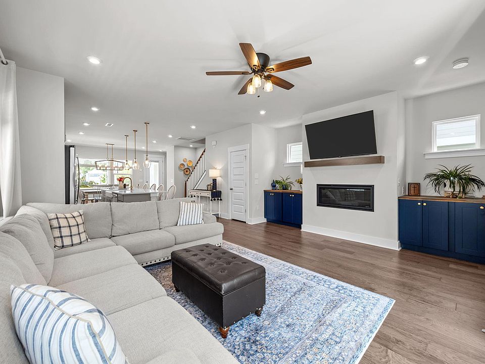 This beautifully designed home blends contemporary finishes with everyday functionality, nestled within one of Pittsboro's most vibrant, walkable communities. Step inside from the inviting front porch to an open-concept main level featuring engineered hardwoods, abundant natural light, and thoughtful upgrades throughout. The kitchen impresses with quartz countertops, a porcelain farmhouse sink, stainless steel appliances, herringbone tile backsplash, and ample prep space, ideal for both daily living and entertaining. The spacious living area centers around a gas fireplace with custom built-ins, while oversized sliding doors open to a fenced side yard, perfect for pets, play, or relaxing outdoors. Upstairs, the owner's suite offers a large walk-in closet and a spa-inspired tiled shower with floor-to-ceiling detailing. Two additional bedrooms feature cozy Berber carpet. Over-the-garage shelving provides smart, out-of-the-way storage, keeping your home organized without sacrificing square footage. Additional highlights include a tankless water heater, upgraded lighting, added windows for natural light, privacy blinds, and a garage EV charger outlet. Smart-home features include programmable thermostats, smart lighting, and a Wi-Fi-enabled garage door opener, all controllable from your smartphone or Alexa. A transferable 10-year structural warranty provides added peace of mind. Located just minutes from trails, parks, the YMCA, and the shops and restaurants at Mosaic, this home offers more than just a place to live — it's a lifestyle.