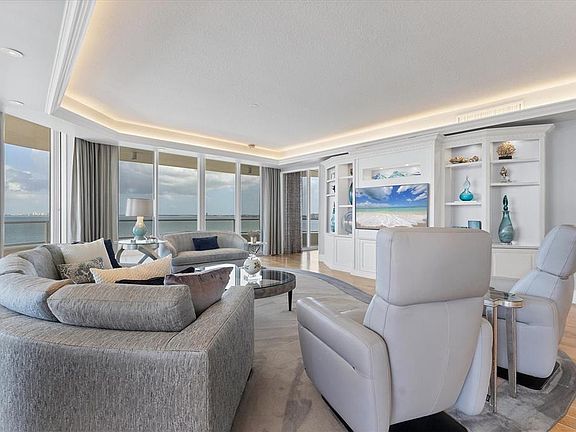 Experience luxury coastal living at its finest in this beautifully updated and fully furnished 3-bedroom, 3.5-bath end-unit condo located in the prestigious, gated community of Grand Bay on Longboat Key. Perched on the 8th floor, this 2,781 sq ft residence offers sweeping, unobstructed views of Sarasota Bay, the marina, and the city skyline—visible from every room. Step off the elevator into your own private foyer and be immediately drawn into an elegant, light-filled space framed by floor-to-ceiling windows and glass sliders. This end unit boasts a wraparound terrace that captures both sunrise and sunset-colored skies, providing the ultimate indoor-outdoor living experience. Multiple seating and lounging areas on the covered terrace make it the perfect setting for entertaining or relaxing while watching the boats go by. Inside, high-end finishes and thoughtful upgrades are found throughout. Engineered wood flooring flows seamlessly through the main living spaces, complemented by large-format tile in the dining area. The renovated kitchen features new countertops, designer backsplash, under-cabinet lighting, an appliance garage, and top-of-the-line appliances including a Sub-Zero refrigerator, Miele cooktop, Bosch double oven/microwave, and Bosch dishwasher. Bar seating and an eat-in area create a comfortable and functional space for casual dining. The formal dining room, surrounded by floor-to-ceiling windows, places the Bay front and center, creating a stunning backdrop for every meal. The living room includes custom built-ins and a sleek updated wet bar with a double door bar fridge, ideal for entertaining. The residence also features a Lutron lighting system, electronic shades, and an integrated sound system for effortless ambiance and comfort. The primary suite is a private retreat with expansive Bay views, a completely remodeled spa-style bath with dual vanities and water closets, an oversized walk-in shower, a dedicated makeup vanity, and a fully outfitted walk-in closet with built-in storage and a safe. The second bedroom, currently used as a den, features custom built-ins, a full en-suite bath, closet, and stunning Bay views. A partitioning shade offers privacy when used as a guest suite, and the sleeper sofa adds flexibility. The third bedroom enjoys its own private terrace with beautiful water views and an en-suite bath. Additional features include two premium side-by-side upper-level parking spaces and a private storage locker. Residents enjoy 24-hour gated security, on-site management, two bayside heated pools and spa, four Har-Tru tennis courts, a well-equipped fitness center, clubhouse with social activities, and exclusive access to the Bay Isles Beach Club on the Gulf. Grand Bay is ideally located adjacent to the Longboat Key Club Moorings Marina, perfect for boating enthusiasts. Just minutes away are the shops and restaurants of St. Armands Circle, the pristine beaches of Longboat and Lido Key, and the vibrant arts and culture scene of downtown Sarasota. This is a rare opportunity to own a move-in ready, meticulously maintained Bayfront residence with world-class views and resort-style living. Schedule your private showing today.