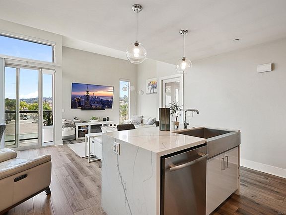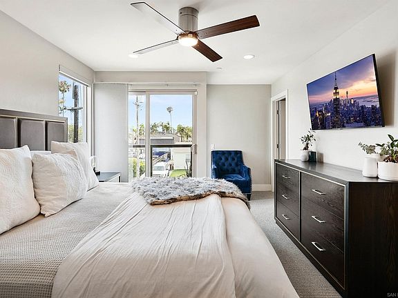 Welcome to this beautifully crafted fully furnished townhome that offers the perfect blend of sophistication and modern comfort. This corner unit boasts a contemporary showroom-style design, filled with abundant natural light and breathtaking panoramic views of the San Diego Bay, Downtown Skyline, and the picturesque Wooded Hills of Point Loma. Ideal for someone seeking a turn-key opportunity, this property is equipped with top-tier features including Jenn-air stainless steel appliances, quartz countertops, luxury vinyl plank flooring, and an oversized farm sink. Enjoy outdoor living on the rooftop deck complete with a built-in BBQ and fridge, or relax indoors with amenities such as a Juliet balcony, expansive walk-in shower, and contemporary carpet. The home also includes Kohler plumbing fixtures, a tankless water heater, high-pressure laminate designer cabinetry, and central heat & AC. For convenience, two underground side-by-side parking spots come with an added EV charger and storage space. Located close to Shelter Island, the beach/bay, and the village, this fully furnished townhome offers easy access to all the vibrant attractions San Diego has to offer, making it move-in ready for its next fortunate occupants.