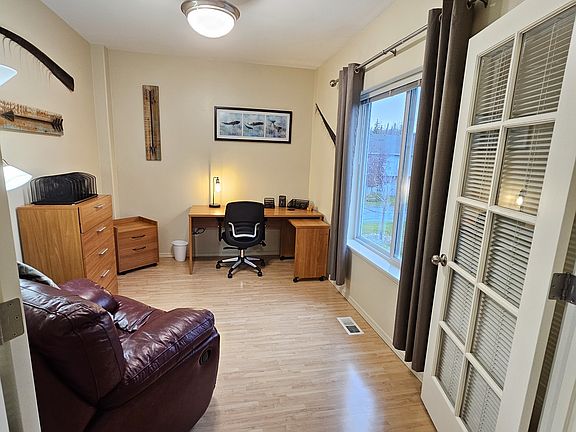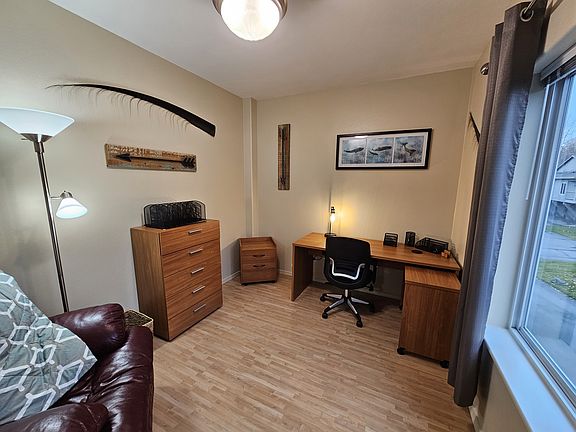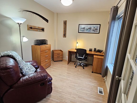 3rd room currently furnished as a complete office space. Roomy and bright natural light. Has a beautiful reclining leather chair. Office furniture is a stunning 4 piece matching set with rolling chair. Printer stand with drawers and large file cabinet/storage drawered unit.
