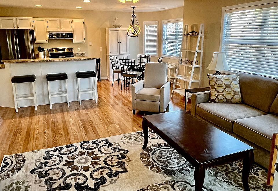 The popcorn ceiling has been removed throughout the condo and has been freshly painted.