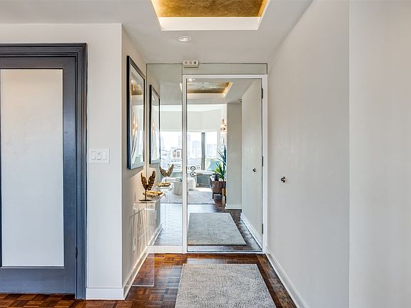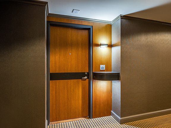 Indirect cove lighting that enhances the ambiance-- Solid teak floors throughout-- Modern kitchen featuring Bosch convection oven, microwave, and refrigerator-- Spa-like bathroom with travertine marble flooring, a dramatic back-lit countertop, and an oversized travertine-clad shower-- Two bay windowsone with a cozy banquette and built-in storageplus a private balcony, flood the space with natural light and frame the dazzling cityscape.Resort-style amenities include