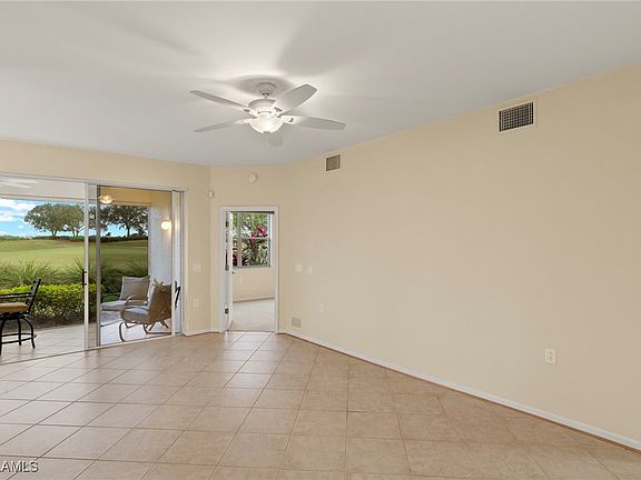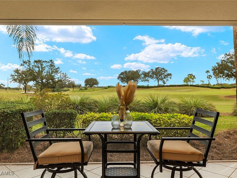 Discover the perfect blend of convenience and resort-style living in this exquisite first-floor coach home with attached 2 car garage with room for a golf cart and 1 car or easily fit 2 cars in the prestigious Verandah community. Boasting serene views on the well manicured fairway of the famous "Old Orange" 4th hole , this 2-bedroom + den, 2-bathroom residence offers an idyllic retreat for those seeking the Southwest Florida lifestyle. This is the "cool side" of the street to enjoy your upgraded picture framed screened lanai with morning sun and afternoon shade creating a perfect balance throughout the day.