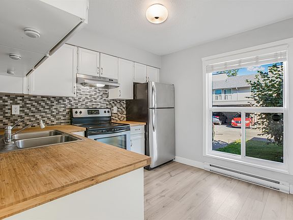 Welcome to a gorgeous end unit townhouse at Clearbrook Village. This recently renovated 3-bedroom, 2-bathroom home is ideally located near Rotary Stadium, shopping and restaurants, and schools at all levels - WJ Mouat Secondary is across the road. Featuring newer paint, floors, bamboo kitchen countertops, stainless steel appliances, updated bathrooms, a newer roof, windows, doors and upgraded electrical and plumbing fixtures, and hot water tank in 2017. The living and dining rooms are very bright and spacious. Additional features include a fenced yard, carport parking with potential outdoor parking for 2 or more vehicles. Move in before the Holidays!
