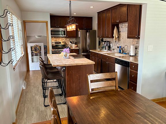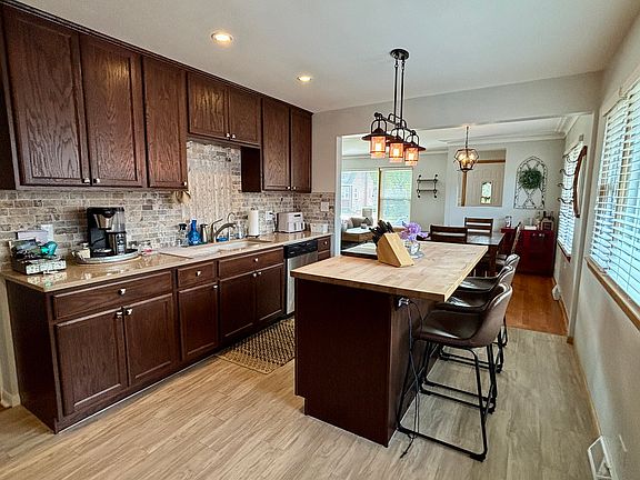 Welcome to this beautifully updated 3-bedroom, 1.5-bathroom home, featuring an inviting open-concept layout that seamlessly blends the spacious living and dining areas. The kitchen is thoughtfully designed with tall brown cabinets, stainless steel appliances, quartz countertops, and an island, creating a perfect space for cooking and gathering. Hardwood floors throughout lead to three well-sized bedrooms, each with custom closet organizers. Updated bathrooms with modern finishes. The fully finished basement offers versatility, including a rec room, home office, laundry area, workroom, space for a workout area and lots of storage space. Outside, the brick paver patio overlooks the backyard which has lots of privacy, complemented by a 2-car garage and shed for added storage. Recent updates newer roof on house and garage, A/C, and hot water heater.