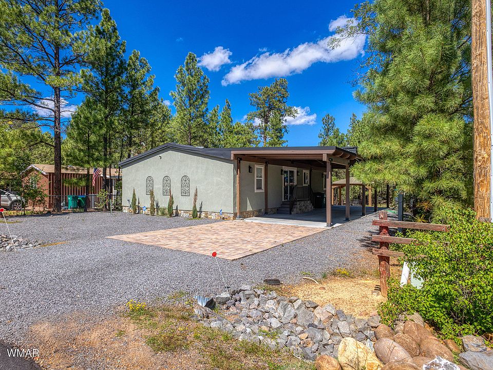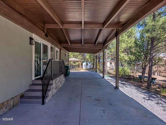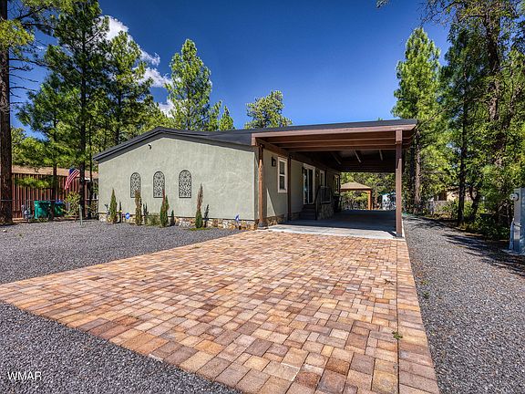 Successful STR for investors or someone wanting a mountain cabin. This stylish home blends contemporary design with rustic White Mountain charm. Nestled among mature trees in a peaceful setting, it offers a serene escape just minutes from downtown. Inside, enjoy an open-concept layout with a spacious family room and split floorplan. Generously sized bedrooms feature updated tile showers, and the primary suite boasts a large soaking tub. The kitchen shines with stainless steel appliances, quartz counters, tile backsplash, and ample cabinetry. Indoor laundry with outdoor access leads to a private backyard with gazebo and 9x16 storage shed. Recent upgrades include new windows, roof, and a custom wood patio. A perfect mix of comfort, style, and location!