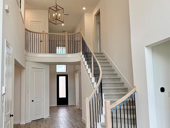 Fabulous 2-story plan by Newmark, the Strasburg, features 4 bedrooms, 3 .5 baths and a 2 car garage. Beautiful 20 ft ceilings in the family room add to the attractive and beautiful large family room windows. Stunning 8 ft door as you enter the home and striking tile floors flow throughout the common areas with a 50 in. electric fireplace. Main suite features a large tub and shower, double vanities with upgraded counters, and matte black hardware showcasing a modern feel. Open kitchen reveals stunning porcelain tile countertops, stacked cabinets, and upgraded tile backsplash giving the home that extra stylish appeal. Home also comes with a game room and media for the kids to enjoy plus a study off of the entry for work or play. Huge, covered patio included as well as sprinklers front and back. Modern features throughout this home spark the pickiest buyer's taste.