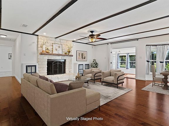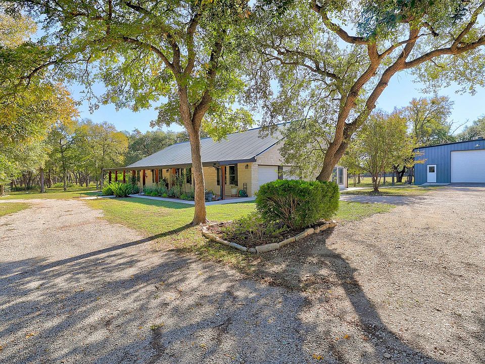 Perfectly situated in a park-like setting on nearly five acres, this beautifully remodeled home exudes modern farmhouse charm while offering comfort, privacy, and practicality. A private gated drive welcomes you to the property, where a full-length covered front porch sets the tone for relaxed country living. Modern efficiency meets convenience with solar panels and a battery backup system. The property also features a custom-built 50’x40’ workshop large enough to accommodate an RV and boat, a 40’x20’ RV carport, and both an attached and detached two-car garage-20'x25’ workshop—ideal for full size trucks and extra storage space. Inside, you’ll find an inviting open-concept floor plan with stylish details throughout, including sliding farmhouse doors that open to a game room complete with a pool table, a dedicated study with sweeping views, and a sunroom outfitted with a bar and keg fridge. Recently upgraded Pella windows fill the home with natural light, accentuating the spacious living areas and thoughtful finishes. The kitchen serves as the heart of the home, showcasing beautiful countertops, a gas cooktop, and stainless-steel appliances—perfect for both everyday living and entertaining. A generously sized laundry room adds exceptional functionality with floor-to-ceiling cabinetry ideal for a pantry, a sink, and an adjoining mudroom for added convenience. Additional upgrades include a tankless water heater, water softener, propane tank, private well, public water available to connect to and dual AC units for year-round comfort.