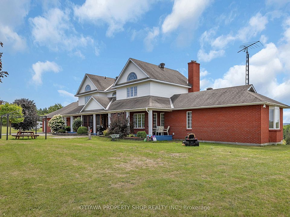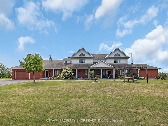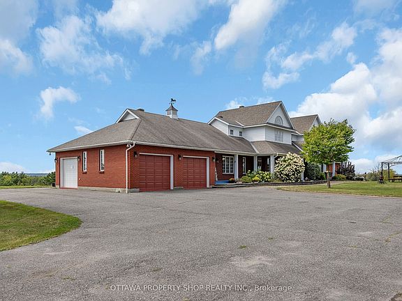 Offering breathtaking views, spectacular sunsets, mature trees, a winding approach, and extensive landscaping, this attractive residence captures the best of both worlds: the seclusion of the country, yet just minutes to the conveniences of Kanata and Ottawa all with the luxury of fiber-optic internet in the countryside. Set on 25.55 acres, this extraordinary estate blends privacy, elegance, and modern comfort. The impressive approximately 4,700 sq. ft. home showcases timeless architectural details, abundant natural light, and a thoughtful layout. At the heart of the home is a gourmet kitchen, thoughtfully designed with maple cabinetry accented by crown molding, sleek Corian countertops, glass-front cabinets, and a center island with breakfast bar. Smart features such as a microwave sling, lazy Susan, desk nook, bread pantry box, and extensive storage solutions enhance both function and style. The main level also features elegant double French doors, expansive principal rooms, and a cathedral-ceiling primary suite with extensive closets and a spa-inspired ensuite with double vanity, oversized shower, and tiled floors. Upstairs, two staircases lead to three generously sized bedrooms, each enhanced by vaulted ceilings, Palladian windows, and balcony access with sweeping views of the property. The walk-out lower level extends living space with a recreation room, games area, hobby room, office/den a full bath with oversized shower, and ample storage. Patio doors open to a 20 x 30 interlock stone terrace, seamlessly connecting indoor and outdoor living.