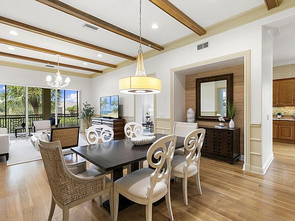 Discover refined living in this beautifully appointed three-bedroom, three-and-a-half-bath end unit, ideally located on the second floor and offering sweeping lake views along with access to exceptional community amenities. This former model has been impeccably cared for and is move-in ready, boasting a variety of high-end upgrades such as a recently installed roof, elegant marble flooring in the entryway, quality engineered hardwood, 8 foot solid-core doors, and upgraded no-see-um lanai screens. Upon entry, you're welcomed into a spacious, open-concept living and dining area that features 11-foot ceilings adorned with detailed wooden beams, intricate wainscoting, and double crown molding that adds a touch of sophistication. The primary suite is a true retreat, highlighted by a custom-built bed accent wall, California-style closets, and a luxurious bathroom outfitted with full-height mirrors. The expansive kitchen is perfect for cooking and entertaining, with granite countertops, extensive cabinetry, a breakfast bar, and a cozy nook for casual dining. A custom built-in enhances the family room, while vertical pleated shades and plantation shutters provide privacy and style throughout. The two-car garage, located on a quiet cul-de-sac, adds both convenience and privacy. Enjoy peaceful lakefront living paired with carefully designed interior details that create a perfect balance of comfort and elegance. Residents of the award-winning Fiddler's Creek community have access to a range of luxury amenities including a resort-style clubhouse and spa, fitness center, multiple pools, two championship golf courses, tennis and pickleball courts, bocce, fine and casual dining options, and a rich calendar of social events. Optional memberships for a beach club and marina are also available