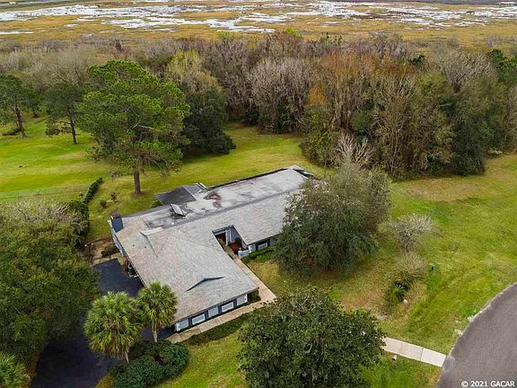 This home holds the character of its time with endless possibilities sitting on 4 acres on Paynes Prairie. Enjoy your view of nature from every angle in the home through colossal windows an sliding glass doors. The large pool that sits in a room on its own is also surrounded by sliding glass doors so just step outside and sun bathe while watching the sandhill cranes after swimming; the pool is heated by solar. The home has beautiful parquet floors throughout and stunning woodwork. The large master suite features his and her closets, a library his and her full bathrooms with heat lamps to warm you and a large bedroom with colossal windows and sliding doors to the pool. The kitchen features a rare granite with lots of storage a dual load dishwasher, double ovens, cutting boards at every corner built in to the cabinets, pull out shelves and a pass through bar to the formal dining and living area. Off of the main living area there is a beautiful Florida room with new wooden shutters and a wood burning fire place; Enjoy a drink from your wet bar and load the wood burning fireplace from right inside the home while enjoying the amazing view. There is not enough room for the description; this home is a must see.