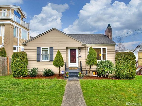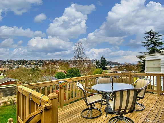 Charming 1940's Interbay cottage features an entertainment sized deck with gorgeous views of Mt. Rainier, the city skyline & stunning sunrises. Tons of potential; build up, build new, build a backyard DADU. Living room & bedrooms have original hardwood floors. Gas fplc. insert will keep you cozy. Updated bathroom w/Kohler soaking tub. Vintage kitchen w/eating space overlooking the view. Newer dbl. paned windows, furnace, electrical & plumbing. Bsmt. garage. Near metro bus/Interbay retail.