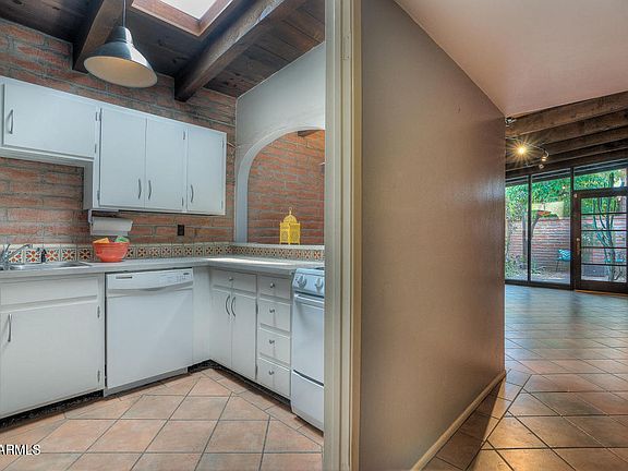 Mid century modern condo in the excellent Spanish Gardens community! Features 2 Bedrooms and 1 Bath. Skylights in the Living room, Kitchen and Bathroom. Entire place has tile installed. You'll have your own large private backyard and personal storage shed.. Conveniently located next to one of two community pools and right in the heart of Phoenix. Includes 1 covered parking spot, and plenty of guest spots. Washer/Dryer hookups in house. Key Words Exposed Brick