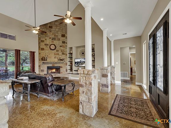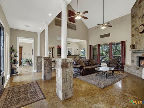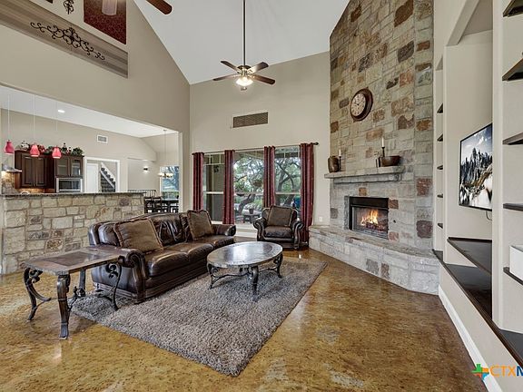 Welcome to your private Hill Country retreat! Nestled on 4.5 beautifully manicured acres dotted with mature shade trees, this stunning 3,400 sq ft two-story home offers the perfect blend of elegance, comfort, and functionality. The main home features 4 spacious bedrooms and 3 full bathrooms, with thoughtfully designed spaces throughout. The living room impresses with soaring cathedral ceilings, a floor-to-ceiling stone fireplace, and built-in bookcases, seamlessly opening to a gourmet kitchen with custom cabinetry, granite countertops, a walk-in pantry, copper farmhouse sink, and a formal dining plus breakfast area. Stained concrete floors add warmth and durability throughout the main living spaces. The downstairs primary suite boasts a tray ceiling, spa-like bath with dual vanities, garden tub, walk-in shower, and a large walk-in closet with custom built-ins. A second bedroom downstairs includes its own ensuite bath—ideal for guests or multigenerational living. Upstairs, a versatile loft area leads to a bonus room, two additional bedrooms, and a full bathroom. This incredible property also includes a 40x50 metal barn, half of which is a workshop, and the other half an apartment. Need more space? The private casita offers a full kitchen, bath, and laundry—perfect for guests, rental income, or extended family. Enjoy the serene outdoors with a covered patio, rock fire pit, and a large 3+ car garage with oversized bays. The peaceful setting feels worlds away yet is conveniently located near I-35 for an easy commute, and just minutes from historic Gruene, shopping, and dining. Don't miss your opportunity to own a true Hill Country gem—luxury, land, and lifestyle all in one.