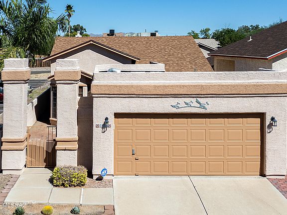 You've arrived at a special listing! Welcome to a turnkey home in Star Trail Estates, near Omni Tucson National Resort. This home's security and privacy, with its direct access from the garage into the home and control of the courtyard gate from the inside, sets it apart from other homes in the community. Guests pass the charming bay window of the breakfast nook on the way to the front door, or may seamlessly continue via the side yard to the back--all within one walled area. Inside, enjoy a great room and kitchen with vaulted ceilings and a French door leading to the back. Split 2 BR/ 2 bath floor plan. Poly pipes replaced in 2025! New roof shingles, 2024. The community pool and playground are steps away. RV storage available for a fee. Good proximity to shopping, dining, and the I-10.