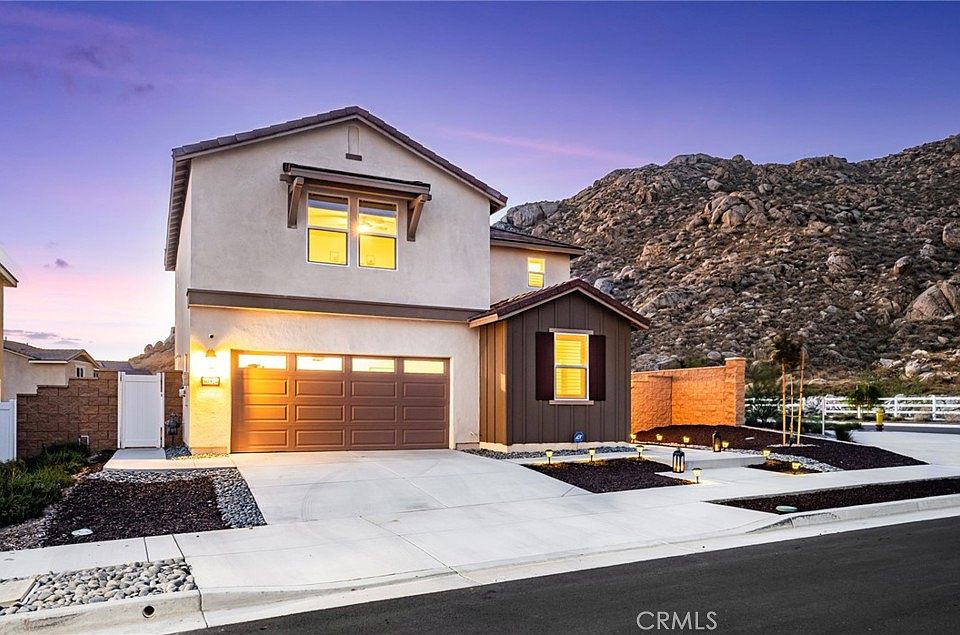 Welcome to this nearly new home, built in 2023, located in the desirable Mountain Edge community of Menifee. This 3 bed, 2.5 bath corner-lot home offers mountain views and modern design throughout. The open-concept main floor features 9’ ceilings, plantation shutters, and a beautiful kitchen with granite countertops, an island with bar seating, upgraded cabinets, and sheet vinyl flooring. A perfect home office space is located downstairs, along with a spacious stand-up storage closet under the stairs, custom remote-control blinds on the sliding door, and a convenient half bath. Upstairs includes all bedrooms, a versatile loft ideal for guests or kids, two full baths, a large laundry room, and an oversized hallway storage closet. The primary suite has a walk-in closet, custom blackout shades, and a soaking tub with shower combo. Carpet throughout the upstairs living spaces, home office and downstairs living room. Energy-efficient with a Sunnova solar lease at just $89/month. The large backyard offers easy access for creating your dream outdoor space or adding a pool. Drought-friendly front yard with rubber mulch and low-water plants. Immaculate condition with builder warranties still in place. Conveniently located near shopping, dining, and quick access to the 215 and 74 freeways.