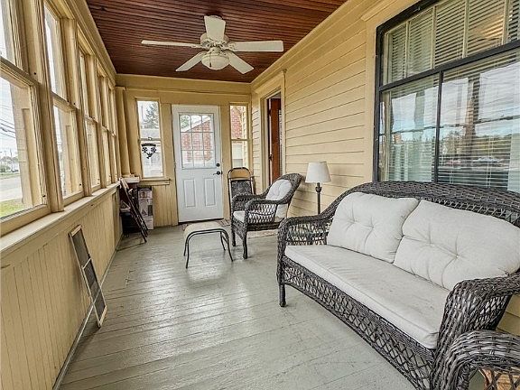 The enclosed front porch is perfect for relaxing with morning coffee or enjoying an evening breeze, adding year-round living space that enhances the home’s appeal. Upstairs, three well-sized bedrooms offer flexibility for sleeping, guest, or home office needs. The large, wooded lot—nearly an acre—provides privacy, shade, and plenty of room for recreation, gardening, or gatherings. The detached garage and driveway offer convenient parking and storage options.