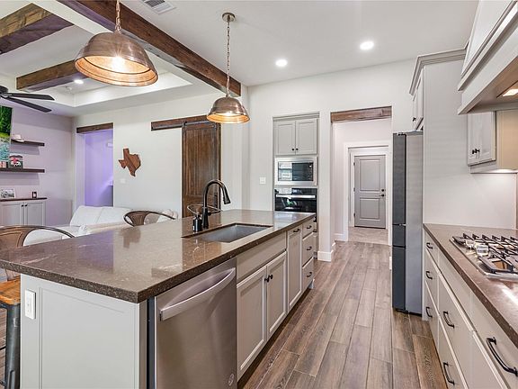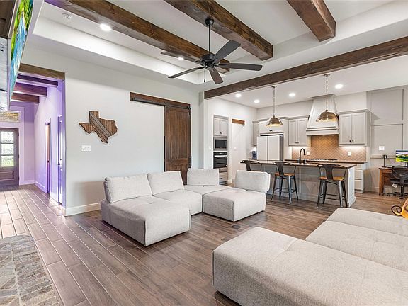 One-owner with upgrades and character you won’t find in the other Teller Dr. homes. Inside, wood-beamed ceilings & brick fireplace create a warm, inviting living space, open floor plan flows into a dream kitchen with a island, gas cooktop, walk-in pantry, dry bar, & ss appliances. The oversized primary suite feels like a retreat with dual vanities, soaking tub, walk-in shower, & custom closet w/ built-ins to keep everything organized. A bonus room w/ sliding barn door offers a stylish spot for office or media room, while the dining room’s board-and-batten accent wall adds a designer touch. Evenings shine on the covered back patio w/ retractable shades, wood-paneled ceiling, & string lights. Oversized rooms throughout gives everyone space to spread out, & the home’s thoughtful layout & storage options make entertaining effortless. Amenities like walking trails, parks, playgrounds, & community ponds, this move-in ready Bryan home stands out from the rest.