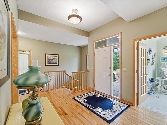 Tucked at the end of a private drive with mature timber, just minutes from the Town Square. Walk up the brick pathway and admire the custom landscaping as you step into this 3-bedroom, 2.5-bathroom home. Inside, natural light fills every room with views of the property, highlighting the vaulted ceilings and warm woodwork of the main level. The living room features built-ins and a cozy fireplace, and is conveniently located just off the spacious kitchen, which boasts deck access, an island with storage, stainless appliances, and a dining area with a view. The master suite is roomy and includes a huge bathroom with two vanities & soaker tub, creating a private retreat. A full laundry room with a sink & storage is also located on the main level, offering modern conveniences. Downstairs is a large family room with walk-out access to the one-of-a-kind property and a luxury wood stove, creating the ultimate cozy atmosphere. The lower level also has impressive storage, two more bedrooms, and a full bathroom. The star of this home is the exterior & land. The oversized garage doors make storing campers or boats easier. The garden is a customized masterpiece with stone pathways, electricity, & plumbing, and sits just off a bridge to the timber for walks in the woods. This home has been meticulously maintained & is set on an acreage with rare features in a great location.