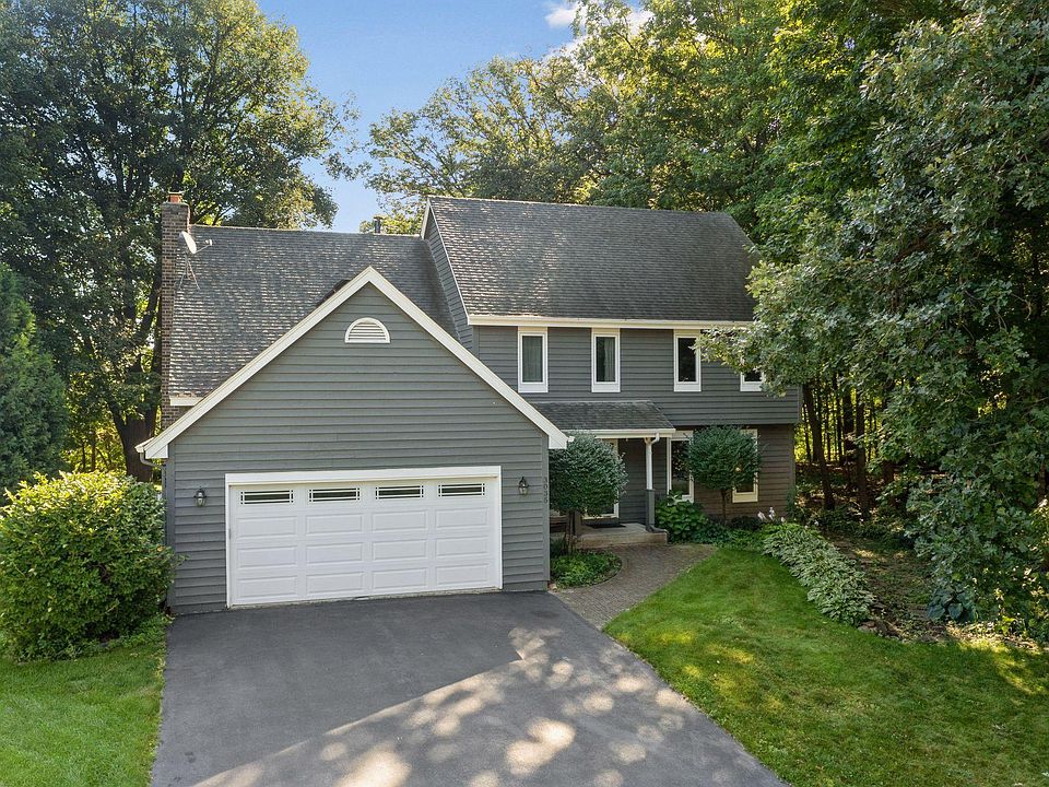 Charming two-story tucked into pretty wooded lot in highly-regarded Autumn Woods neighborhood. Your spacious lot features a large deck and patio, plus lots of playable space and a helpful shed at the back of the lot. Inside you'll find a large living room with hardwood floors which flows nicely into your dining room (presently used as a home office). The kitchen features stainless steel appliances and lovely backyard views. Eat dinner in the informal dining area just off the kitchen and adjacent to the deck access. You'll want to enjoy those Fall days and evenings in this yard! Onto the very spacious and lovely family room with fireplace - just a great space to unwind and watch your favorite show or game. Main floor also features mudroom and laundry room with utility sink. Upstairs you have everything you need with a large primary suite, including private full bathroom and closet. Three junior bedrooms upstairs plus a full junior bathroom with two sinks and shower & stool separate. Lower level is a great play area, gym, amusement room and more! Also note the wonderful hobby room and extra storage spaces. Neighborhood features two large play parks with open fields plus fun play structures. You are less than 2 miles to Target, Cub, Home Depot and restaurants. Lovely walking trails throughout neighborhood and area.