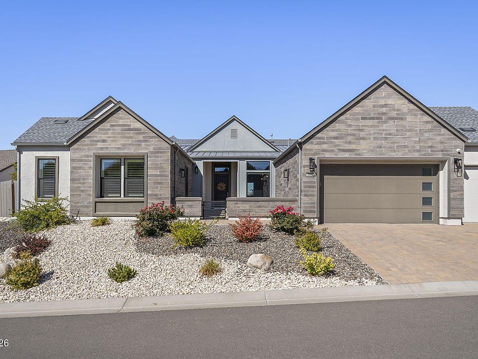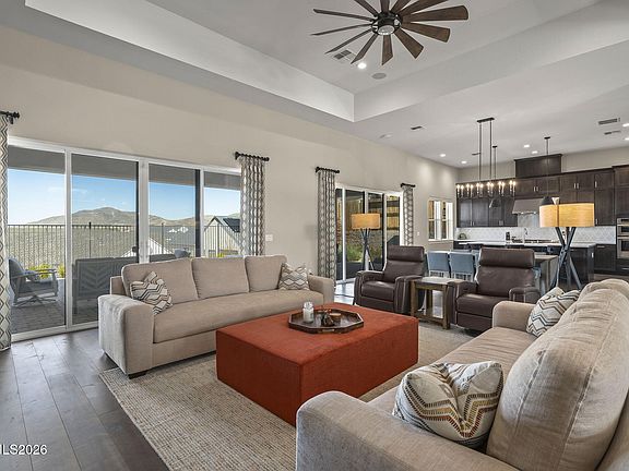 Welcome to effortless luxury in the gated Ridgeline community at Caramella Ranch. Built in 2021, this like-new single-level home offers 3,691 square feet of thoughtfully designed living with four bedrooms and three and one-half baths, beautifully balanced for both everyday comfort and easy entertaining. From the moment you step inside, high ceilings, engineered hardwood floors, custom lighting, and a sleek linear gas fireplace set a modern yet inviting tone. The kitchen strikes the perfect balance between timeless and trendy, featuring clean lines, contemporary finishes, and a layout that flows seamlessly into the great room, ideal for gatherings large or small. The floorplan is exceptionally well designed. A private bedroom with full bath sits on one side of the great room, while the primary suite and two additional bedrooms are tucked away on the other. The primary retreat is spacious and serene, complemented by a spa-inspired bath with a walk-in shower, dual vanities, and custom built-in cabinetry in the walk-in closet. The two secondary bedrooms share a stylish Jack-and-Jill bath, making the layout both functional and flexible. Everyday living is elevated with a large laundry room complete with built-in cabinetry, shelving, a sink, and a convenient drop zone for coats and shoes. The three-car garage is finished with epoxy floors, adding a polished touch to your parking and storage space. The true icing on the cake is the backyard, designed for entertaining and relaxing alike. A spacious patio, fire pit, and views of the city, mountains, and valley create an ideal outdoor escape. Dual sliding doors from the great room and kitchen, plus additional access from the primary bedroom, make indoor-outdoor living effortless. Low-maintenance landscaping in both the front and back keeps life easy. Enjoy all that the community has to offer, including a clubhouse, pool, and the peace of mind that comes with security gates. This is modern living at its best; stylish, comfortable, and ready to enjoy.