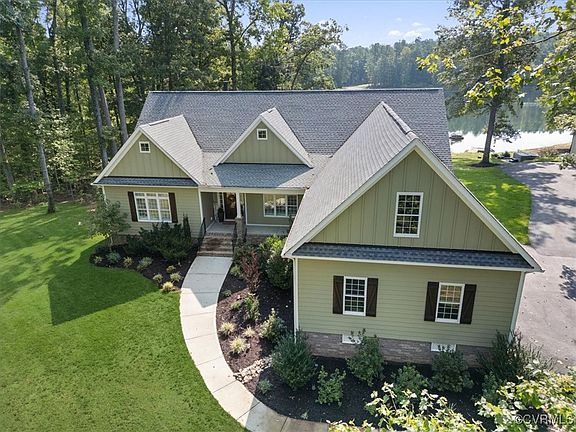 Find home with this lakefront estate in Central Powhatan, where every detail has been meticulously crafted for ultimate comfort & style. This home features a private dock, inviting you to jump right in or easily put your boat in. The outdoor living spaces are perfect for year-round entertaining, featuring an outdoor kitchen, waterfront fire pit, & a dedicated hot tub pad, all set against the backdrop of breathtaking lake views. Step inside to discover an expansive first floor, highlighted by grand primary suite that serves as a personal retreat. The suite includes a custom-designed closet system and a spa-inspired bathroom with both soaking tub & walk-in shower. Two additional bedrooms on this level ensure ample space for family and guests. Each additional bedroom has their fair share of amenities and share a spacious bathroom. The three-season room, accessible from the living area, is designed for year-round enjoyment with added insulation beneath the deck for ultimate comfort. The chef’s kitchen is a masterpiece of design and functionality, featuring newly added custom cabinetry, a wine cooler, a generous island with barstool seating, & a pot filler above the smooth top electric range. Additional conveniences include a wall oven, wall microwave, and a newly added custom pantry. The eat-in kitchen offers a stunning waterfront view, perfect for savoring meals while enjoying the serene surroundings. The heart of the home is the living room, where a stunning floor-to-ceiling brick wood-burning fireplace serves as a focal point. Tall ceilings enhance the space and invite an abundance of natural light, beautifully complementing the lake views. The open layout seamlessly connects to a dining area. Upstairs, the theatre room provides an exceptional space for leisure & entertainment, complete with its own full bath & storage closet. Complete with a paved driveway and detached garage & 3 car attached garage, this home combines elegant design with modern amenities to create a truly exceptional waterfront sanctuary.