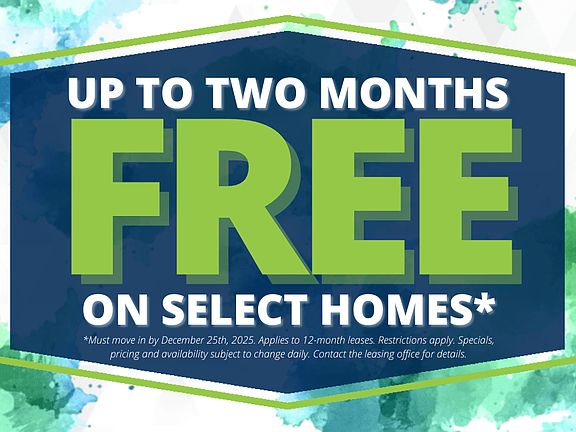 - Special offer! Up to Two Weeks Free on select homes! *Must move in by December 25th, 2025. Applies to 12-month leases. Restrictions apply. Specials, pricing and availability subject to change daily. Contact the leasing office for details.