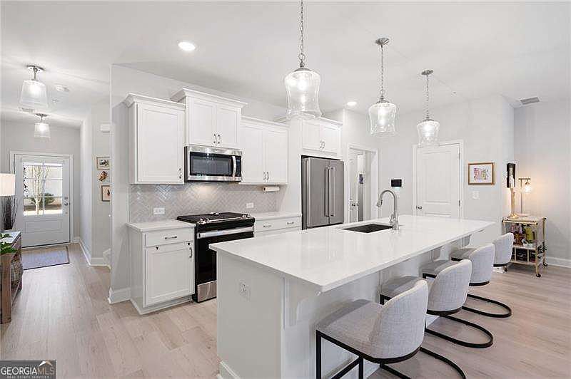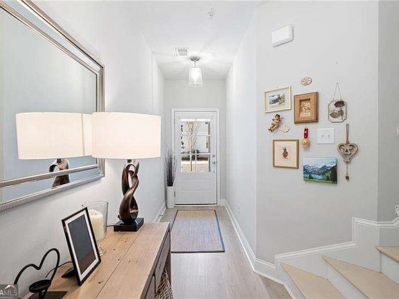 Nearly brand new townhome on one of the best lots overlooking trees - no homes behind this one. Over $15k in upgrades by owner (Security System Installed, Custom Built Closets, Window Screens in all windows along with built in shades, and new refrigerator.) Easy living with main-level garage. This open concept plan features high-end luxury vinyl flooring, crown molding, neutral paint and a sleek design. Oversized Primary Suite includes a sitting area, a luxurious bathroom with double vanity, and NEW walk-in Custom Built closet. 2 additional bedrooms (New Custom Built Closet in 2nd bedroom as well), 1 full bath, and the spacious laundry room complete the upper level. Patio opens to grassy area that can be fenced in - ideal for pets, entertaining or privacy. High Parc at Smyrna is only a few minutes or even walking distance from Ruby's Pizza! And, easily accessible to so many great areas - Smyrna Market Village with the local favorite Farmer's Market and the anticipated StillFire Brewery, Vinings, Buckhead, Midtown, Downtown, Braves stadium and the Battery. Pool in the community just a few steps away. Low HOA fees.