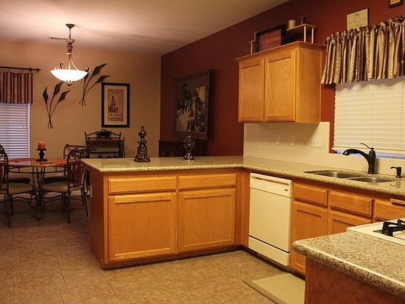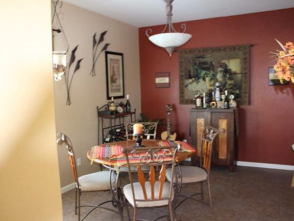 A beautiful, move in ready, 3 bedroom 2 bath, Mediterranean style home featuring laminate floors in the living room and hallways, tile in the kitchen, dining room, bathrooms and laundry room and fresh, luxurious carpeting in the bedrooms. In the kitchen, upgraded granite counter tops, with ample cabinetry and additional cabinetry in the adjacent hallway. A large breakfast bar is situated between the kitchen and dining room and serves as a cozy gathering place while entertaining. The master bedroom, with en suite master bath and voluminous walk-in closet, is secluded on the opposite side of the house from bedrooms 2 and 3. The living room is located in the center of the house and is situated to take advantage of the cool evening breeze. French doors provide access to the covered patio for ease of al fresco entertaining and enjoying the mature landscaping. Of course, dual pane windows, custom blinds and ceiling fans throughout to ease the summertime heat.