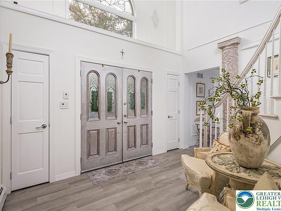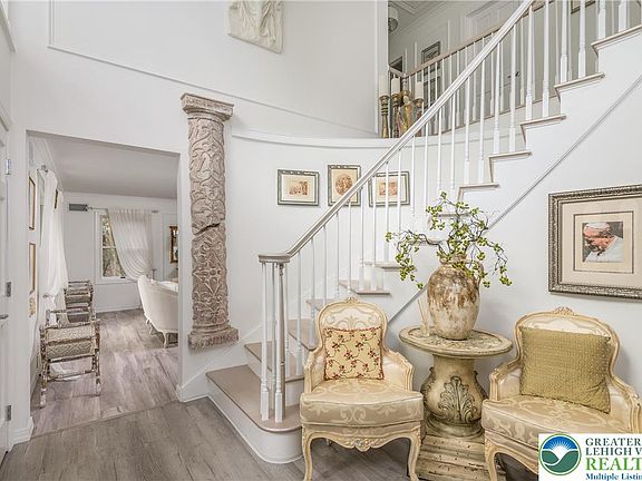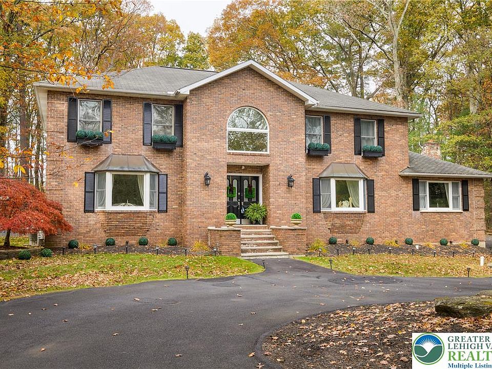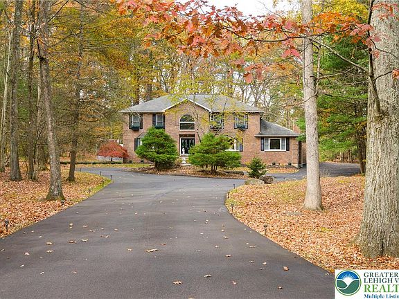 Experience refined living in this stunning, meticulously designed 4-5 bedroom, 3.5 bath brick residence tucked away on a quiet cul-de-sac. Arrive through a circular driveway framed by professional landscaping and a classic fountain, setting the tone for the elegance within. A dramatic two-story foyer welcomes you with natural light and views into the home's beautifully curated spaces. The designer kitchen serves as the centerpiece, offering custom white cabinetry, quartz countertops, premium stainless appliances, and stylish finishes. Enjoy casual meals in the sun-filled breakfast area or host memorable dinners in the formal dining room. The living room and family room, anchored by a warm fireplace, provide exceptional comfort and flow for everyday living and entertaining. The primary suite is a luxurious retreat with a generous walk-in closet and a spa-inspired bathroom featuring high-end finishes and an elevated modern aesthetic. A fully finished lower level expands your possibilities with additional space suited for a variety of household amenities or storage space. Step outside to an expansive deck overlooking a peaceful, park-like yard—ideal for outdoor dining, morning coffee, or unwinding in nature. A two-car garage, abundant storage, and a serene setting enhance everyday convenience. Home also features a whole house UV water treatment system. Prime location places you minutes from I-80 and all local Poconos attractions. One Year Home Warranty included at closing!