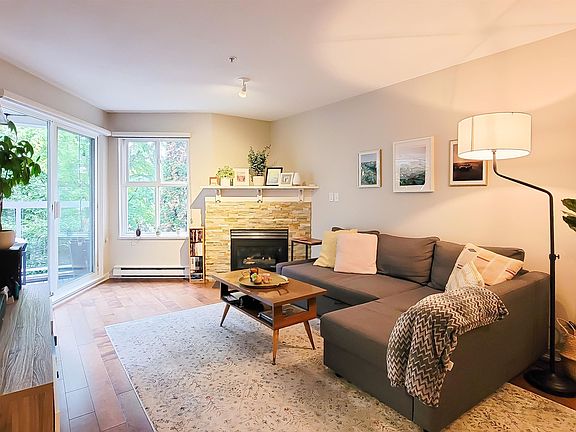 Modern Riverside Living in the Heart of the River District! Experience sunsets and serene Fraser River views from this beautifully updated 2 bed, 2 bath home. The open kitchen boasts quartz countertops, upgraded cabinetry, and stainless steel appliances - perfect for entertaining. Cozy up by the gas fireplace or unwind in your spacious primary suite with walk-in closet and renovated ensuite. Enjoy peace of mind in this fully rainscreened, pet-friendly building with new roof and proactive strata. Steps to the waterfront trail, Romer's Burger Bar, brand new Salmon Stone Childcare Centre, parks, shops, and cafes - embrace the best of riverside living!