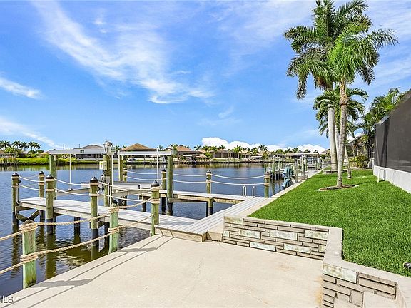 Graced with Western exposure and nestled along the picturesque Faye Canal Basin, which spans an impressive 380 feet at its widest point, you’ll be captivated by breathtaking sunsets and endless aquatic adventures to the Gulf right from your private dock and lift. This home has been elevated to the pinnacle of waterfront living with brand-new storm impact windows and doors, electric shutters on the lanai, panoramic screen cage, a new boat dock and lift, and a paved circular driveway. Additional upgrades include plantation shutters, electric window blinds, a completely refinished pool with new tile and finish, a concrete pathway leading to the dock, a brand-new outdoor kitchen, and underwater fish lights that create a magical glow at night as the water comes alive.