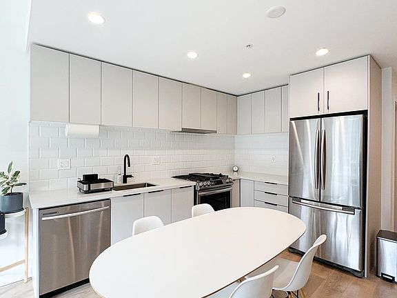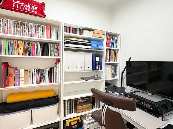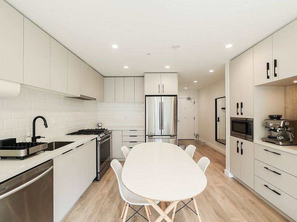 Large windowsModern kitchenStainless steel appliancesGas rangeQuartz countersSleek cabinetryVersatile den