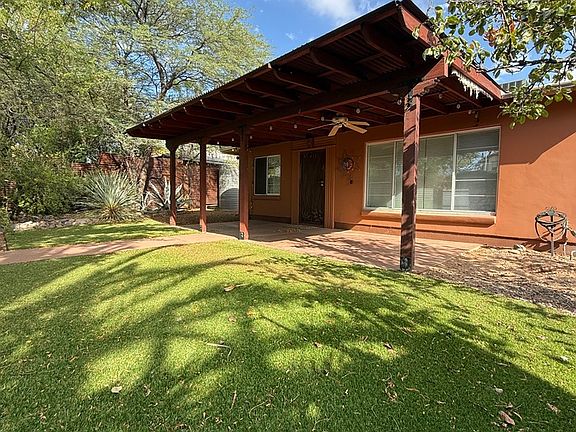 AVAILABLE NOW!! This beautiful three bedroom, three bathroom bungalow is located in the desirable Sam Hughes neighborhood. Bright open floor plan with oversized living room, dining area, ceiling fans, Dual pane Andersen Windows, double brick original construction add extra insulation, cherry wood and ceramic tile flooring throughout. Eat-in kitchen boasts granite countertops, custom cabinets and stainless-steel appliances. Upstairs owner's suite designed by Paulus Architect features sound reducing drywall and insulation, a 7' x 13' walk-in closet with chandelier, carpet and Juliet balcony with views of the Catalina Mountains. Upstairs bathroom features Grecian marble tile surrounding the shower/tub. One of the spare bedrooms has it's own bathroom with walk in shower. Laundry room with utility sink, washer/dryer INCLUDED and shelves for additional storage. The peaceful and private courtyard boasts artificial turf, mature and fruit-bearing trees and covered front patio. Back yard has alley access to the covered carport with ample parking and on street parking available as well. The workshop is not accessible to tenants and the fountain conveys in as is condition. Property also has solar panels to reduce your electric bill. Conveniently located close to down town Tucson, the University of Arizona, Dining and shopping. Pets upon owner approval with $200 non-refundable pet fee and deposit is equal to one month's rent. Must view property before applying and NO ZILLOW APPLICATIONS ACCEPTED.