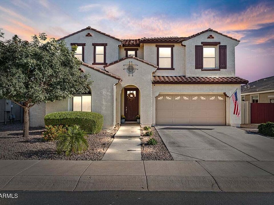 Beautifully appointed 4 bedroom home showcasing a model home styled interior. Step inside to an open layout with wood-look tile floors, soaring ceilings and a calming neutral palette. The kitchen impresses with granite countertops, stainless steel appliances, tile backsplash, ample cabinetry & a center island with breakfast bar. A versatile den with Murphy bed offers the perfect space for a home office or guest room, while the oversized loft provides an ideal entertainment retreat. The primary suite features abundant natural light, a stylish barn door, dual granite vanities, & a spacious walk-in closet. Enjoy Az living in the lush backyard oasis with a refreshing new playpool, low maintenance turf, putting green, & your own citrus! This is the perfect layout for relaxing or entertaining. New HVAC 2024. Surround sound speakers interior. Security system owned.