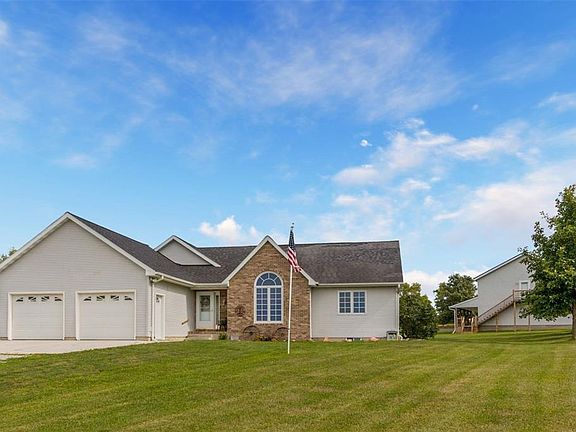 This beautiful acreage is located just outside of Iowa City. It has 2.5 acres, with two additional buildings, and a back pasture. The main level has hand scraped bamboo hardwood floors, cathedral ceiling, an office/study, open dining room, and features a fireplace. Also on the main level are 3 bedrooms, 2 full baths and laundry. The kitchen features hardwood floors, granite counters, tiled backsplash, stainless steel appliances and pantry. Appliances stay with the home. The master bedroom is located on the main level and features carpet floors, conventional ceiling and walk-in closet. The attached master bath includes tile floors, laminate counters, jetted tub, and one-piece shower. The finished lower level features a family room, full bath, workout area, rec room, and storage area. Outside you'll find a large treated wood deck overlooking the yard with multiple out buildings. Exterior features include a great view, back pasture, woodworking shop, and bonus building. Bonus building has large shop, finished main level, and upstairs apartment with two entrances. The house is turned slightly on the property to give a nice view of the tree-line country side and pasture. This home has two driveways, one to the house and one to the detached buildings. **All three buildings on the property are included in this sale. *** Property could be split into two lots - council already approved. The street leading up to the home is reground asphalt